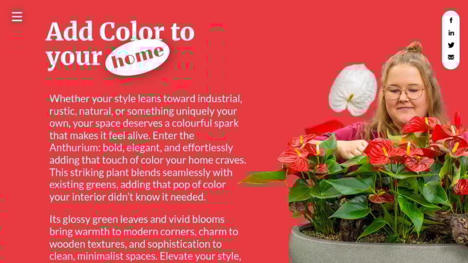 Its glossy green leaves and vivid blooms bring warmth to modern corners, charm to wooden textures, and sophistication to clean, minimalist spaces. Elevate your style, by adding the colors of Anthurium!