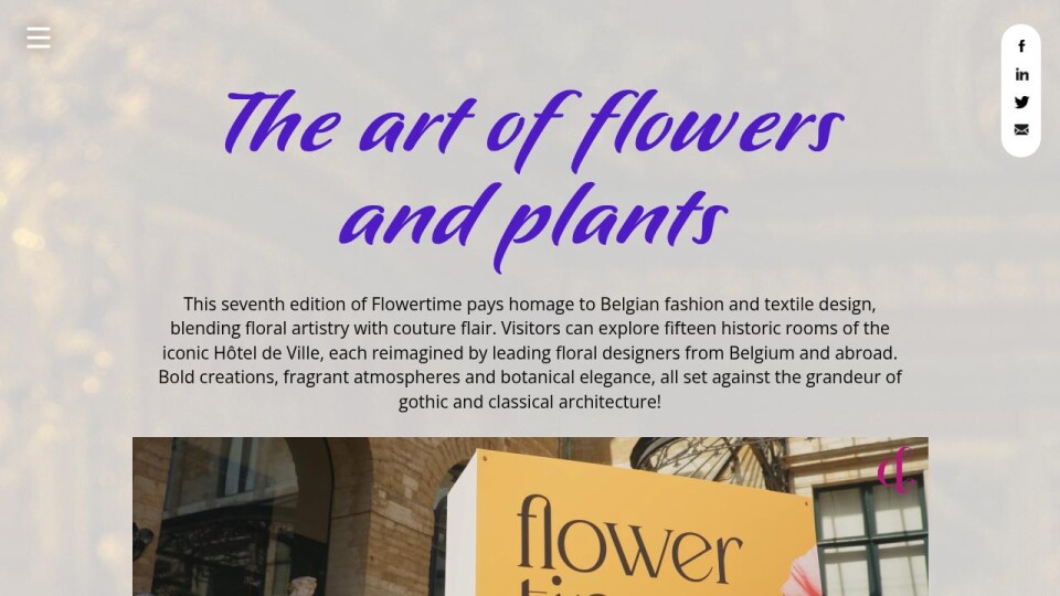 This seventh edition of Flowertime pays homage to Belgian fashion and textile design, blending floral artistry with couture flair. Visitors can explore fifteen historic rooms of the iconic Hôtel de Ville, each reimagined by leading floral designers from Belgium and abroad. Bold creations, fragrant atmospheres and botanical elegance, all set against the grandeur of gothic and classical architecture!
