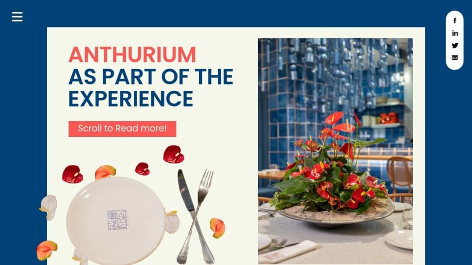 No culinary experience is complete without plants. They soften interiors, add life, and create balance. Anthurium, with its lasting beauty and strong presence, proves that botanical design is as essential to hospitality as food itself.